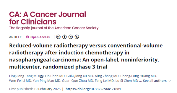 On February 20, 2025, a groundbreaking study led by Prof. Jun Ma, Academician of the Chinese Academy of Sciences, and Prof. Ying Sun and Prof. Linglong Tang from Sun Yat-sen University Cancer Center (SYSUCC) was published in CA: A Cancer Journal for Clinicians (IF: 503.1), marking the first-ever publication of original clinical trial research in the journal’s history. Titled “Reduced-volume radiotherapy versus conventional-volume radiotherapy after induction chemotherapy in nasopharyngeal carcinoma: An open-label, noninferiority, multicenter, randomized phase 3 trial”, this landmark study redefines precision radiotherapy standards and shifts the paradigm from “ensuring survival” to “optimizing survival” for cancer patients worldwide.