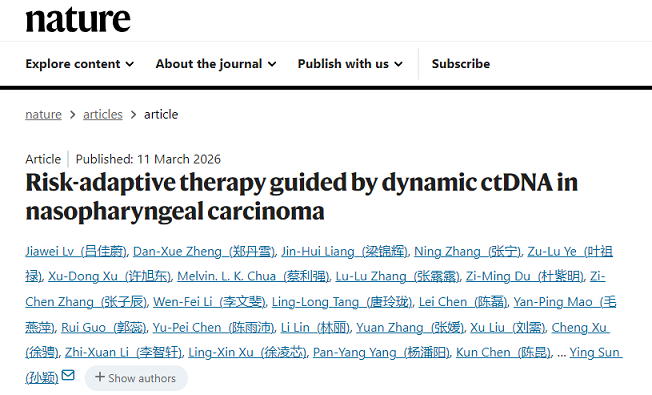 A research team led by Sun Yat-sen University Cancer Center (SYSUCC) has reported a landmark advancement in precision oncology. The study, titled "Risk-adaptive Therapy Guided by Dynamic ctDNA in Nasopharyngeal Carcinoma," was published in the world-leading journal Nature on March 12, 2026.
