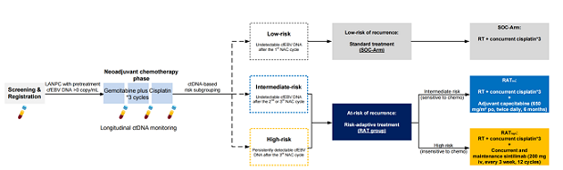 This multicenter, phase II adaptive clinical trial leveraged the "window of opportunity" during induction chemotherapy to monitor patients' cfEBV DNA clearance patterns. Based on these dynamics, patients were stratified into three risk groups, with subsequent treatment regimens adapted accordingly:
