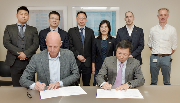 MoU signing: From left to right back row: Dr Liqin Wang (NKI), Prof. Jinxin Bei (SYSUCC), Prof. Xiaofeng Zhu (SYSUCC), Director Zhaoyang Wen (SYSUCC), Christopher Lavender (SYSUCC) and Director of Operations Henri van Luenen (NKI), from left to right in the front row: Clinical Director Prof. Emile Voest (NKI) and Vice-President and Prof. Musheng Zeng (SYSUCC)